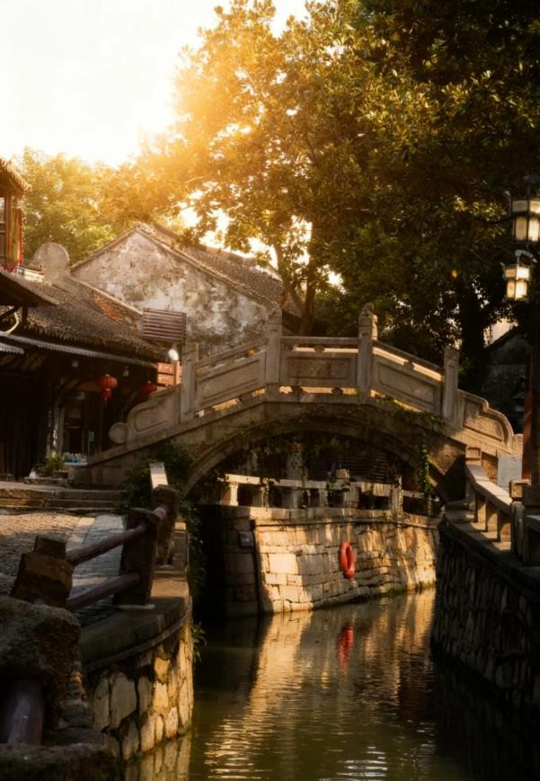 黄昏时分的光最好。古桥被染上金边,河面像溢出的蜜色墨水,倒映着天光与人影。