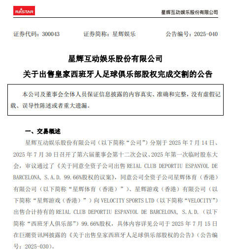 星辉娱乐(300043.SZ)10月9日午间公告,截至本公告披露日,星辉体育(香港)、星辉游戏(香港)出售西班牙人俱乐部股权的相关公司注册变更登记手续已完成。