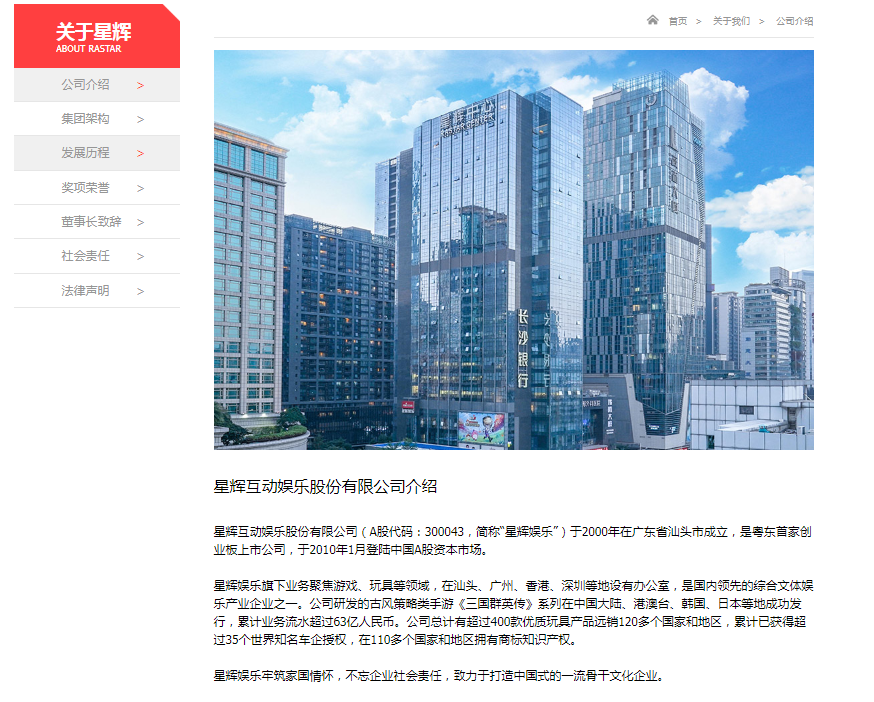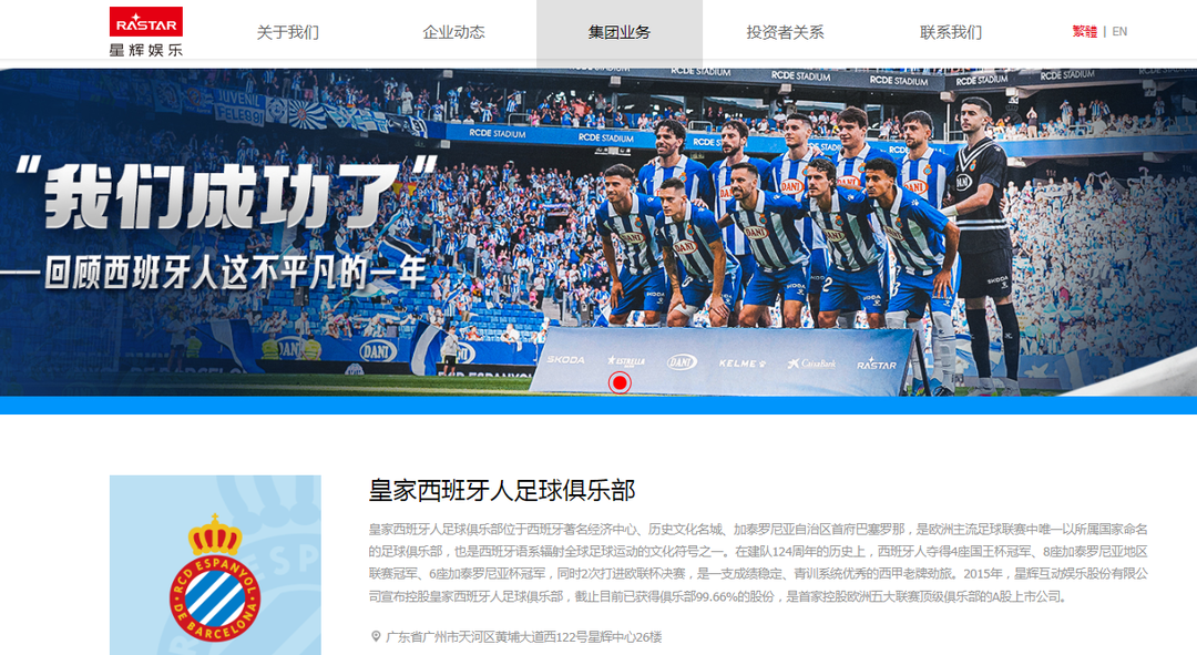 星辉娱乐成立于2000年,于2010年1月登陆中国A股资本市场,业务范围覆盖足球俱乐部、游戏、玩具等领域。2015年,星辉娱乐宣布控股皇家西班牙人足球俱乐部,是首家控股欧洲五大联赛顶级俱乐部的A股上市公司。西班牙人俱乐部位于西班牙巴塞罗那,是欧洲主流足球联赛中唯一以所属国家命名的足球俱乐部。